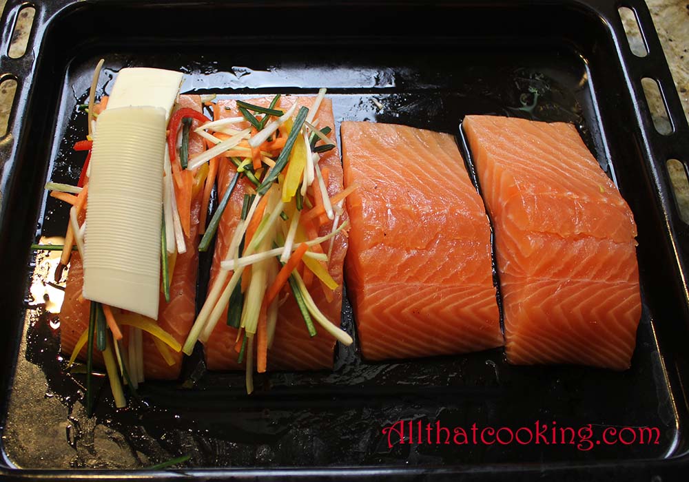 1. Cut salmon into 4 equal serving portions and arrange in a buttered, oven proof dish.