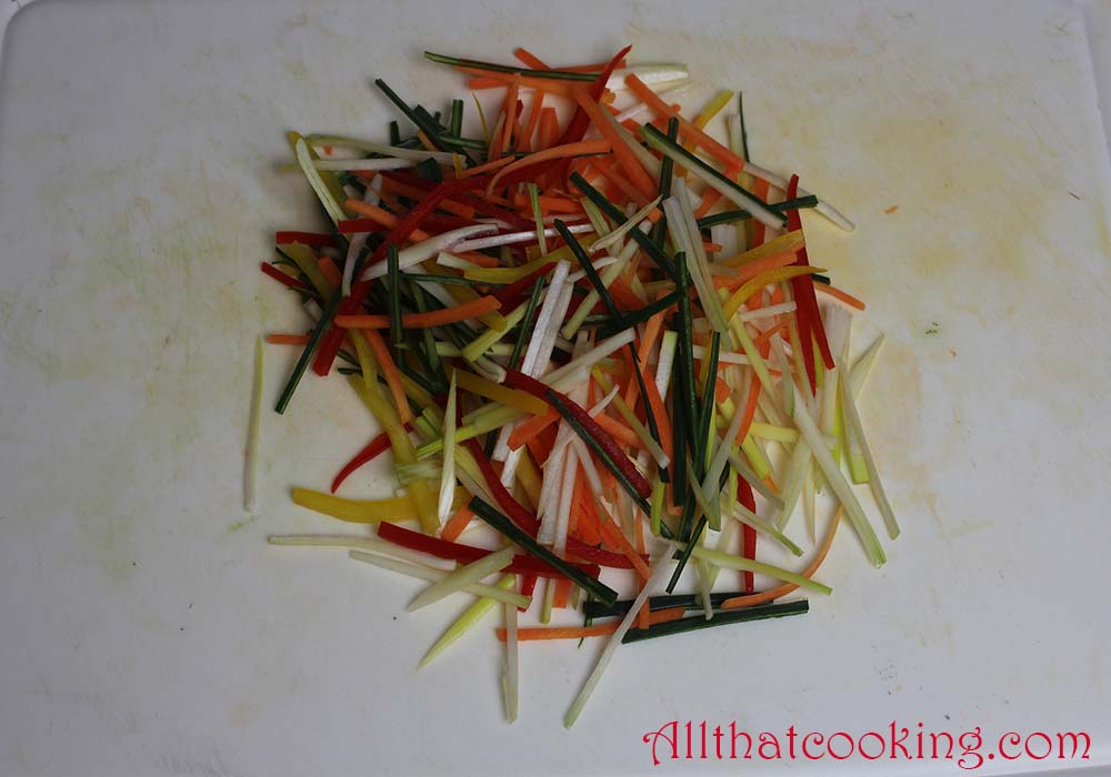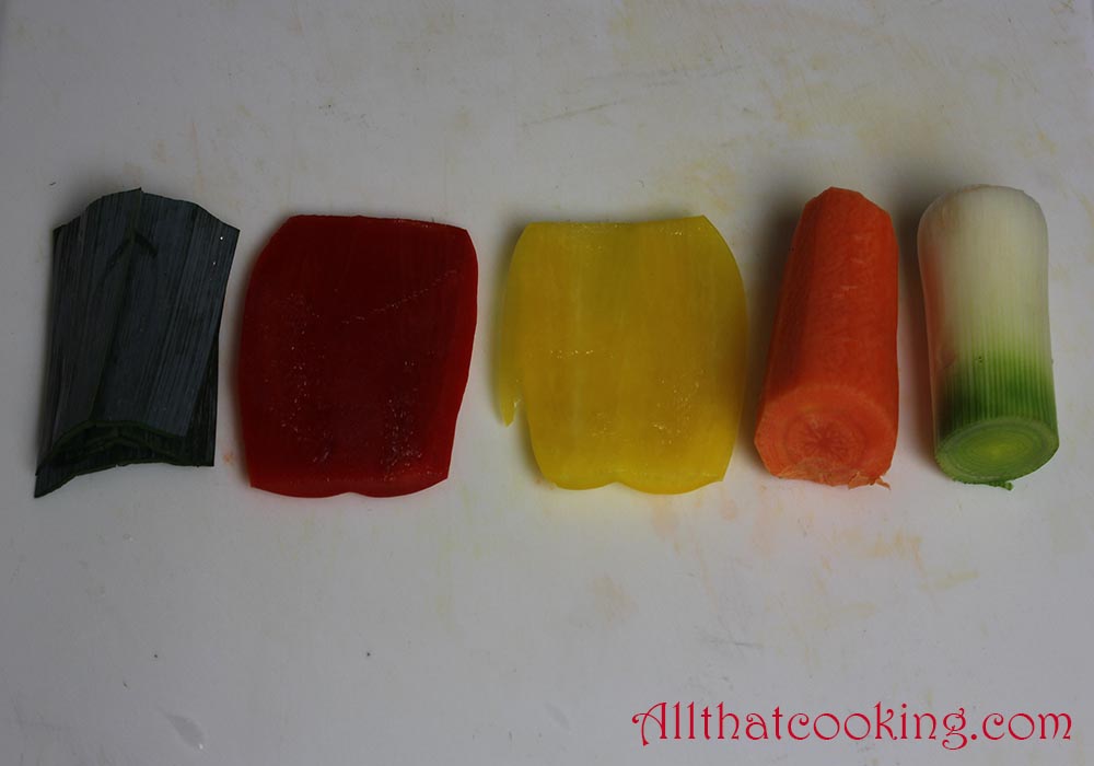 1. Cut bell peppers, carrot and leeks into equal 2-inch lengths.