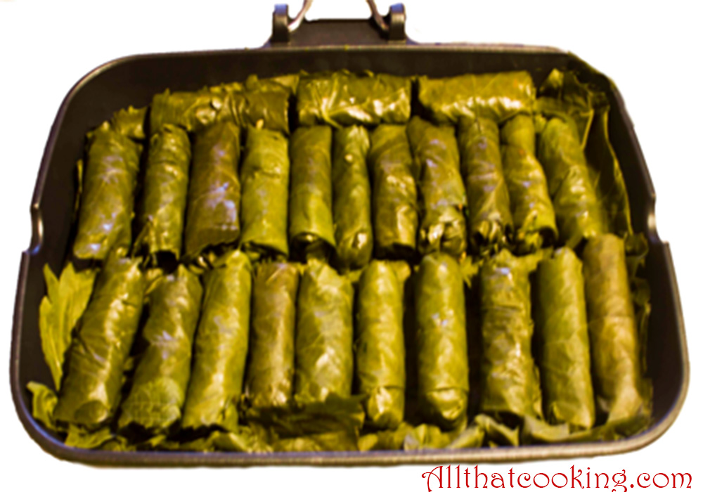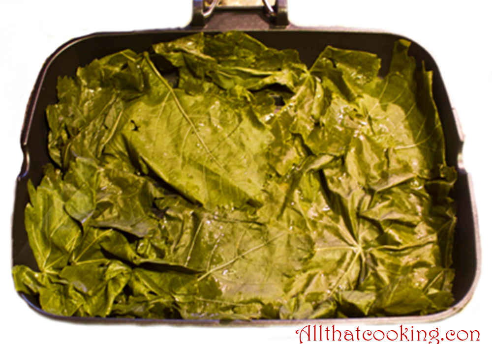 3. Line the bottom and sides of an oven proof pan with left over leaves and any torn pieces of grape leaves. They will keep the rolls from sticking to the bottom of the pan and help to keep them arranged.