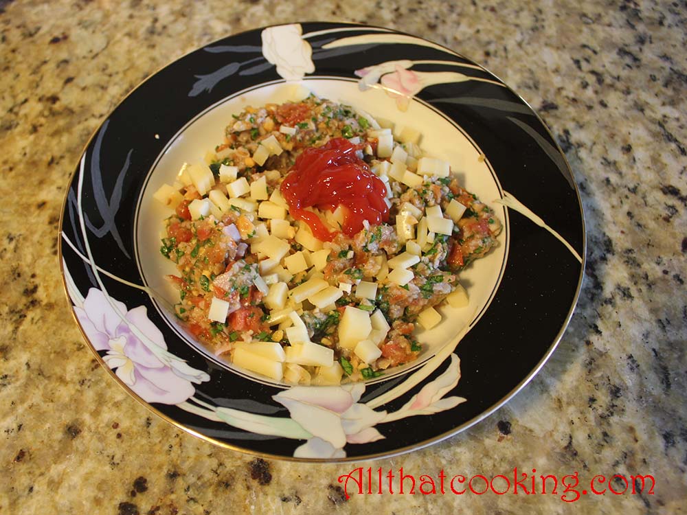 1.  In a medium bowl mix together ham, almonds, tomatoes, parsley or basil, cheese, garlic and ketchup. Salt and pepper to taste.