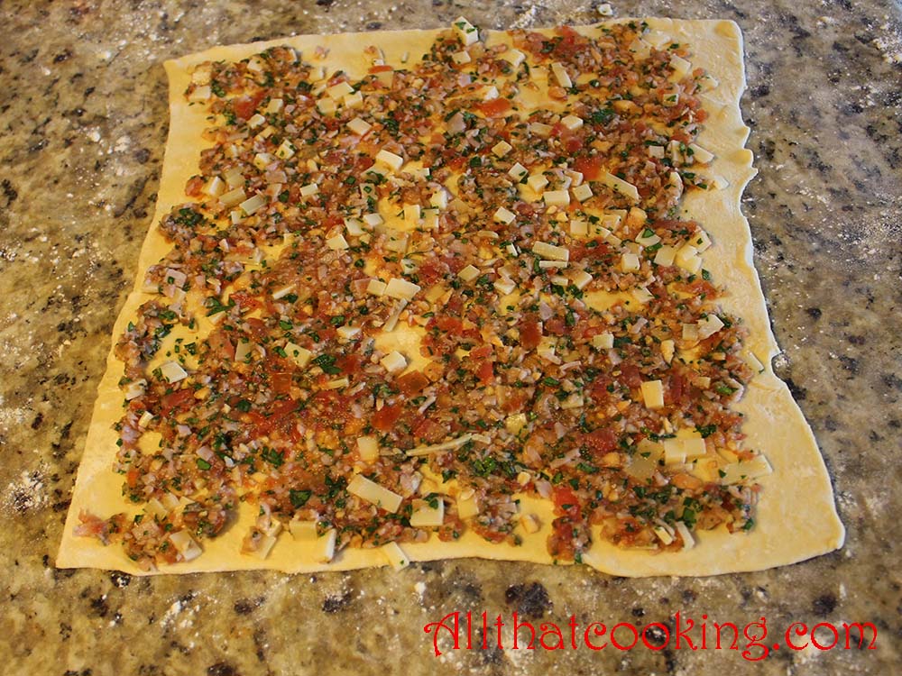2.  Place pastry sheet on lightly floured surface. Evenly spread filling over pastry.