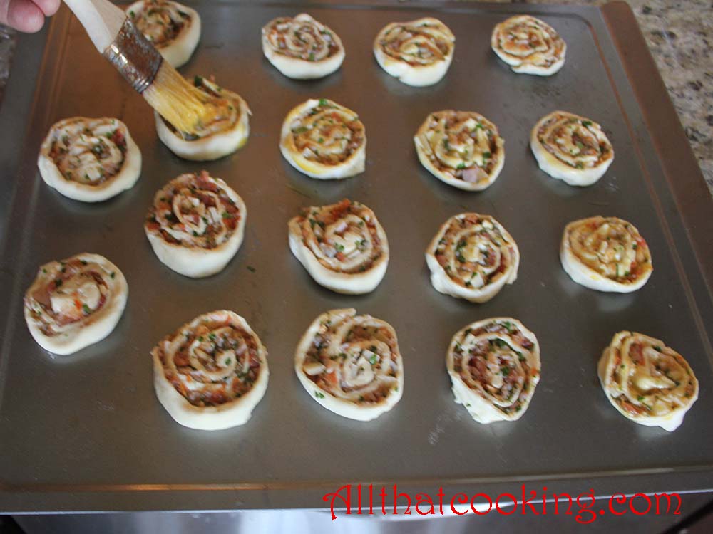5.  In a small bowl, mix egg yolk and milk until blended. Lightly brush each pizza round with mixture.