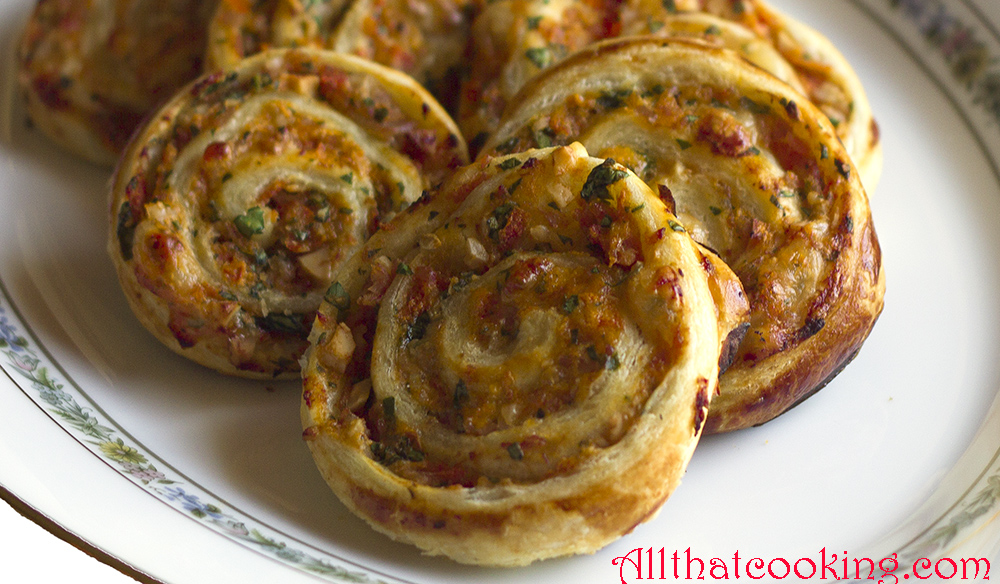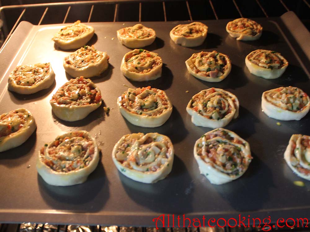 A light puff pastry wrap, a savory filling, a bit of an unexpected, yet subtle crunch from almonds, rich ham, cheese, a few fresh herbs make these little snacks taste and look like you spent hours preparing them.  In reality it’s a quick no brainer that presents an opportunity to use your imagination and those little bits of this and that which you really don’t know what do with.  You can use Oli’s recipe as posted here, or you can certainly make endless substitutions for the filling depending on what’s in your fridge.