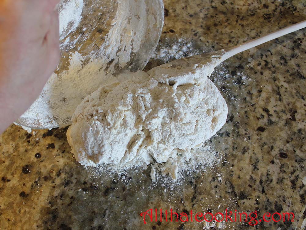 (You can make the dough in a stand mixer as well. Simply place flour, salt and water in bowl of mixer and mix for 5 minutes.)