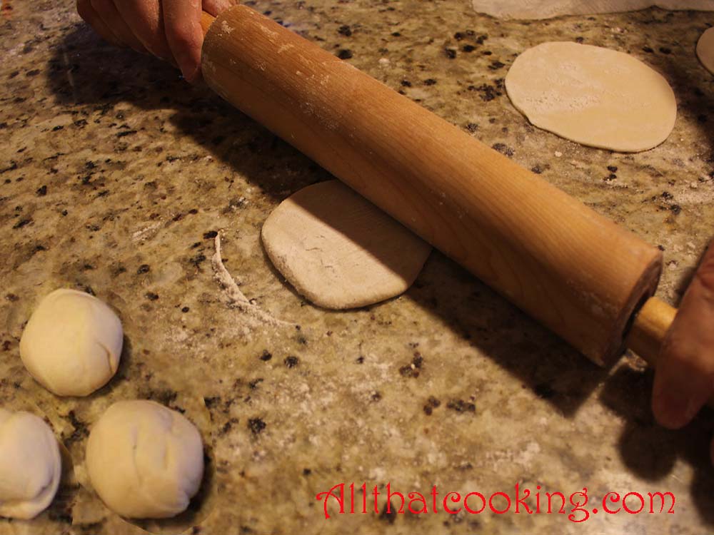 3.  Roll slice into a ball and lightly dust with flour.  Flatten it a bit, then roll it out into a circle about 4-inches in diameter.  Make the center slightly thicker than the edge.