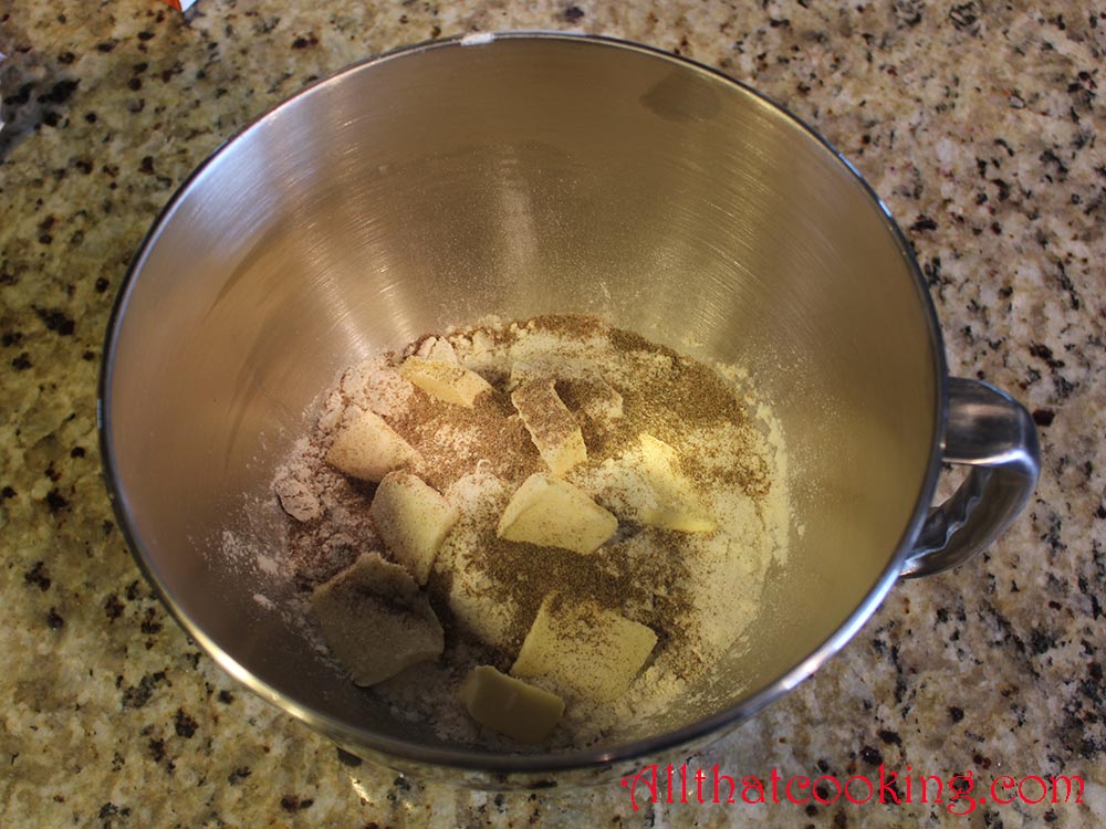 1. Place flour, sugar, cardamom, salt and butter in bowl of stand mixer fitted with dough hook. Mix until no butter clumps remain.
