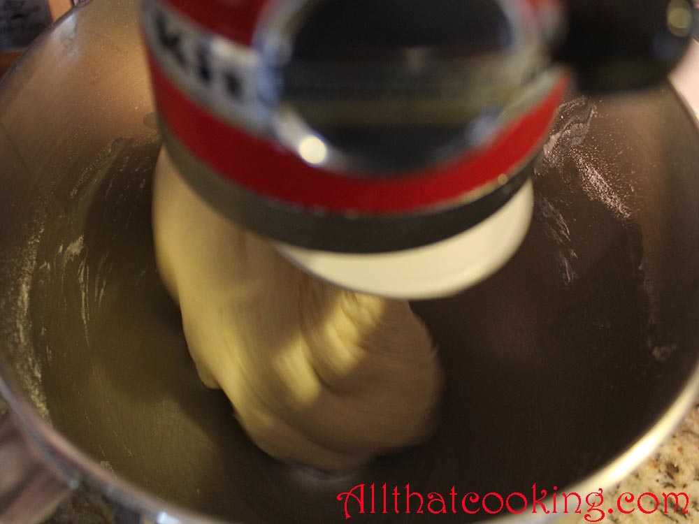 2.  Pour yeast mixture into flour mixture and mix until dough is smooth and pulls away from sides of bowl.