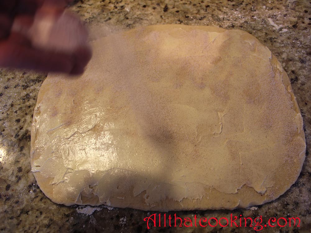 Get reserved filling mixture and evenly spread butter over dough, then sprinkle with sugar and  cinnamon mixture.