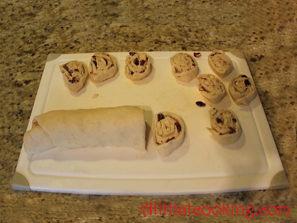 7.  Roll dough, lengthwise in jelly roll fashion then use a sharp knife to cut log into about 20 even slices.