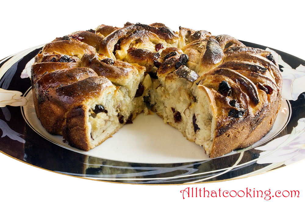 It’s not October 4, but who needs a day to celebrate cinnamon rolls?  So here is Oli’s recipe for a bit of a twist on traditional cinamon rolls – a cinnamon roll cake. The ingredients are in keeping with traditional rolls, but arranging them in a cake pan and turning out one big cinnamon roll cake is Oli’s unique take. (Don’t forget, he’s an Icelander living in Sweden.)   It’s a lovely presentation that is simple to assemble. The cake is not heavy and does not pack a fist full of sugar.  It’s a rich, delicious cardamom scented cinnamon cake that is zesty and just sweet enough.  Instead of the classic raisins in the filling, this recipe uses Craisins. (Hey, when you’re out of raisins use Craisins!)