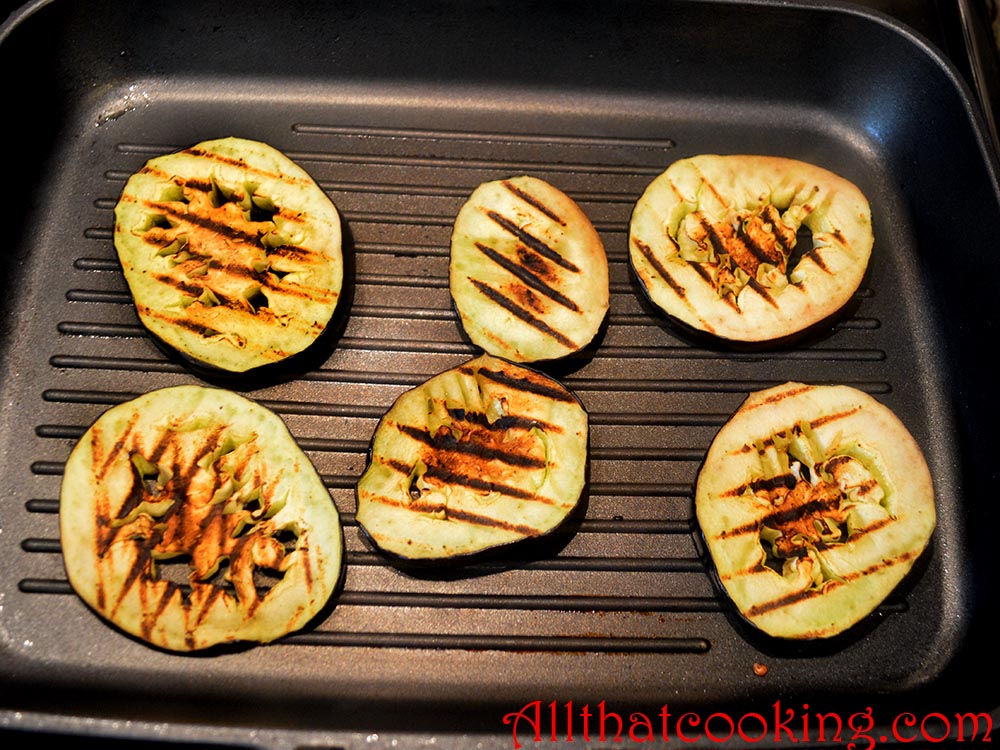 There’s no need to pre-salt the eggplant to remove moisture, nor do you have to peel it. Dry grilling the slices helps to maintain their shape and keeps them from getting mushy. The result is a lovely succulent, meaty texture.