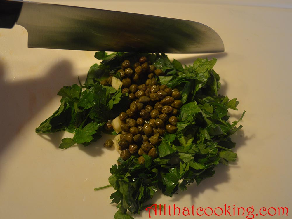 1.  Place parsley, garlic and capers on a cutting board and roughly chop. 2.  Add oregano and peperoncini. Chop until everything is well combined. 3.  Move mixture to a medium size bowl. Slowly add oil and stir until mixture is moistened and holds together.  Pesto should be moist, not swimming in oil. 4.  Salt and pepper to taste.  Reserve.