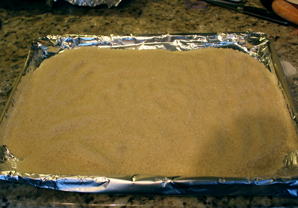 5.  Carefully turn over the dough and return to tray.  Top it again with foil and rice.