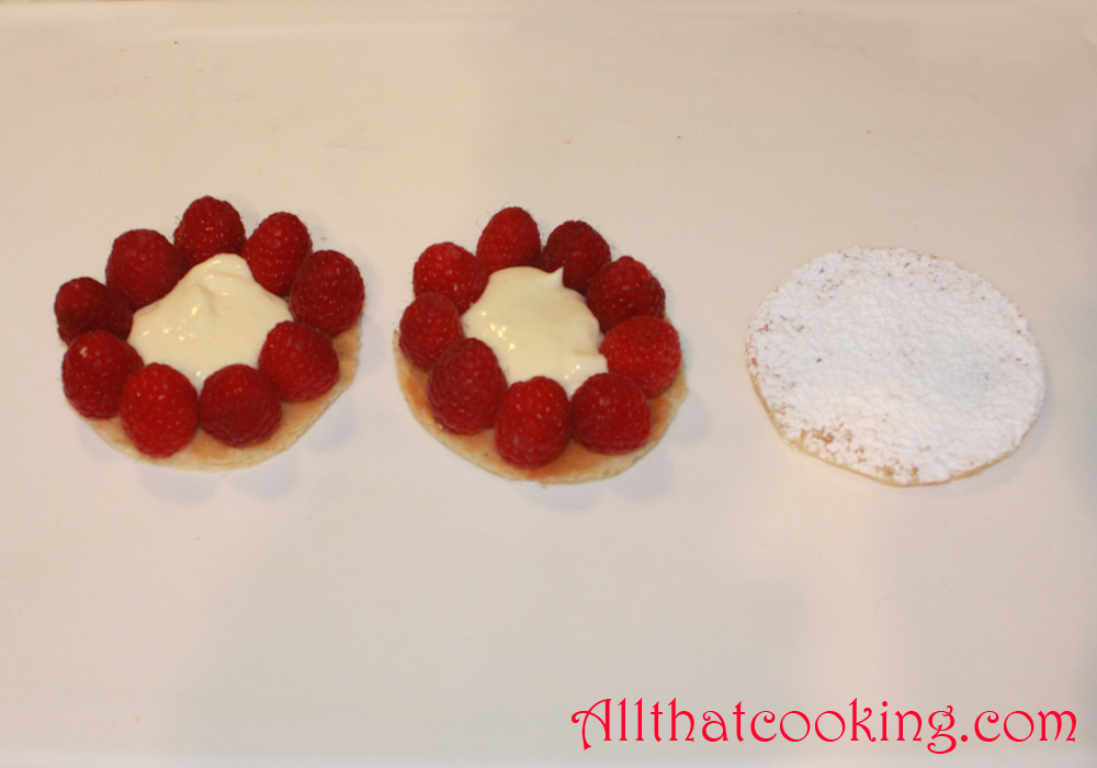 2.  Place one pastry round on a serving plate.  Arrange raspberries around the edge of the pastry, then spoon or pipe crème pâtissière into center.