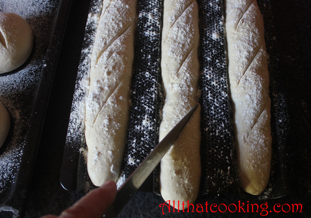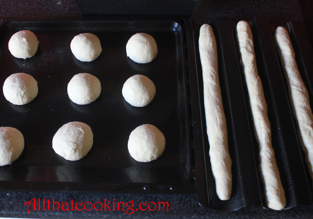 2.  Knead each one for a few seconds and shape into rolls or place in lightly greased baguette pans.  Don’t knead to hard because the dough will become too elastic and if you are making baguettes the dough will be difficult to roll.