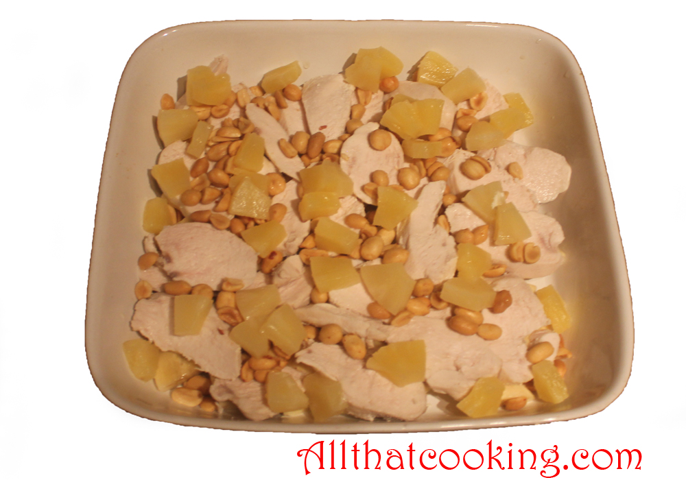 3.  Scatter pineapple chunks over chicken and strew three quarters of the peanuts over this.