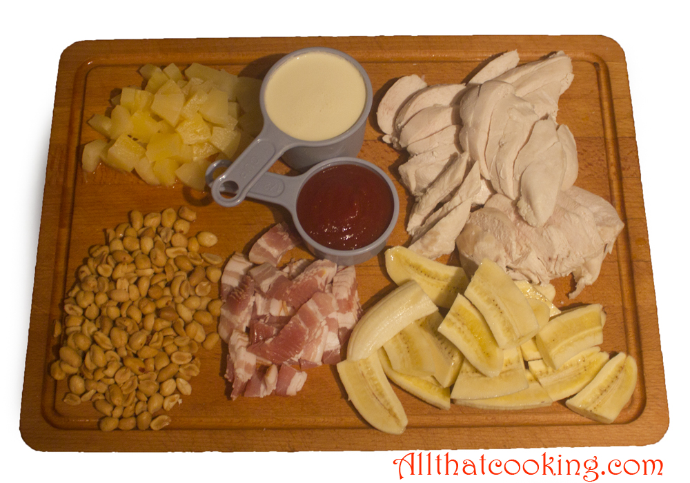chicken and bananas chic,bananas, pinapple,peanuts