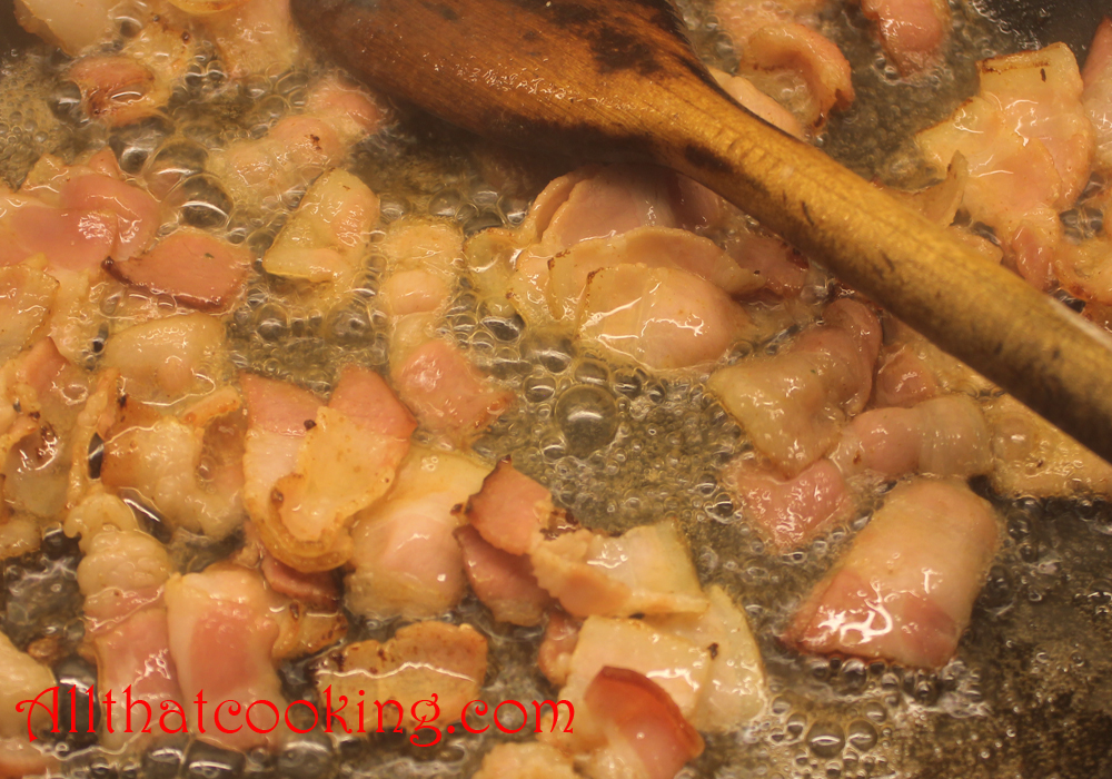7. In medium size skillet, melt one half tablespoon of remaining butter over medium high heat.  Add bacon and cook until tender crisp.  Drain and discard the fat.  Throw bacon into the chicken pot.