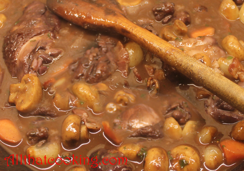 Coq au vin translates to rooster in wine.  Ok, so roosters aren’t plentiful, but chickens are.  Now get your mouth set for chicken marinated in good red wine.  Earthy mushrooms, sweet pearl onions, sweet carrots, bacon bits (who can resist anything made with bacon?) and a few other tasty morsels are then comingled with the chicken and simmered in wine until the meat falls off the bones.  It’s a rich, rustic casserole that is typical French comfort food.  Perfect fare for an intimate dinner in February.