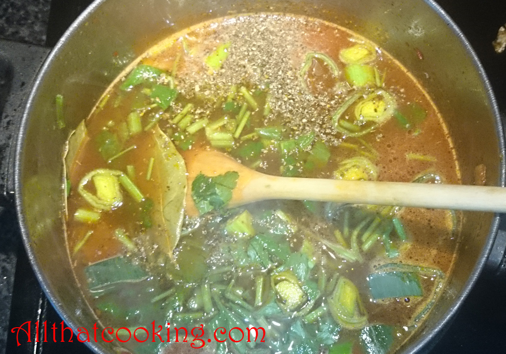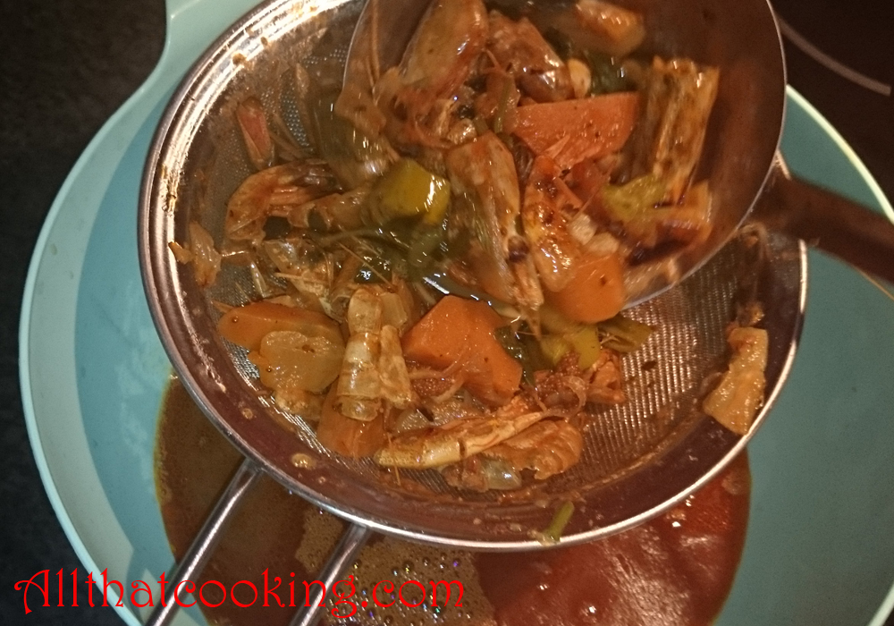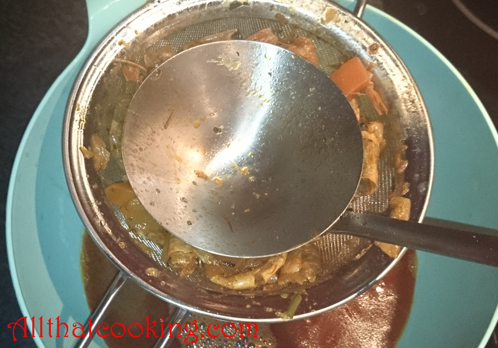 4. Remove pot from heat and remove lid. When stock comes to room temperature strain stock into a large bowl.