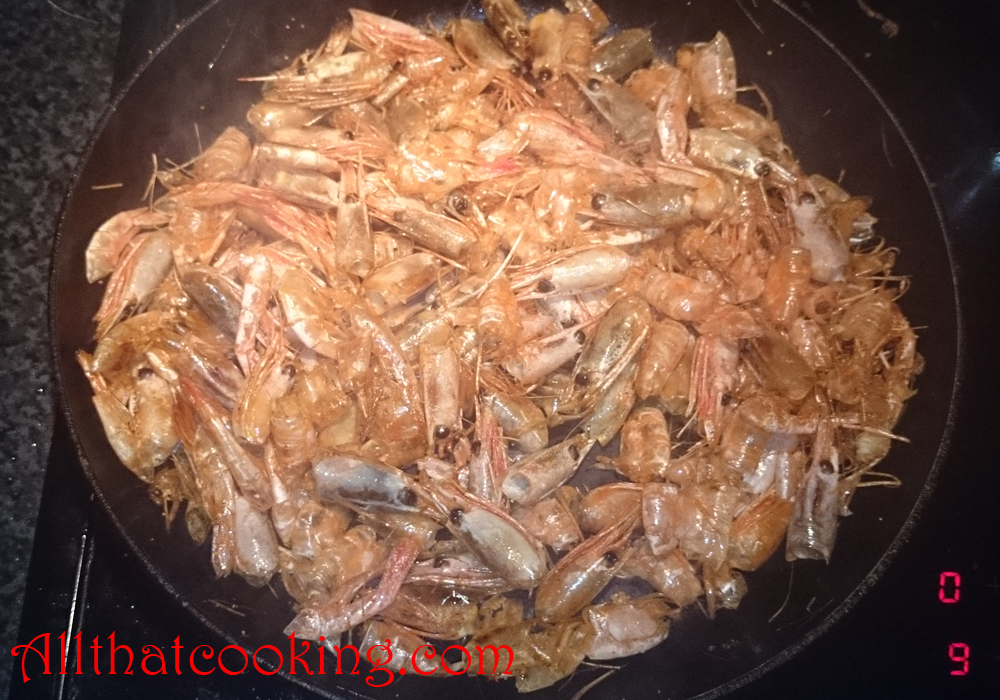1. Heat oil in a large skillet over high heat. Toss in shells, cook and stir continually until light golden brown.
