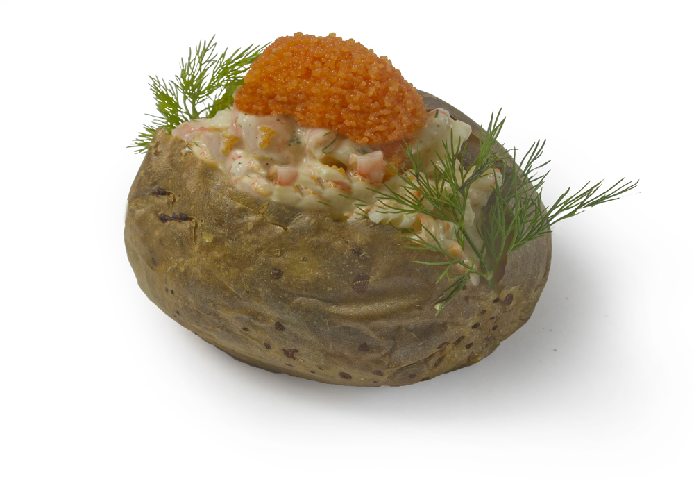 5.  Spoon cold Skagenröra into the warm potato, top with caviar and garnish with dill.