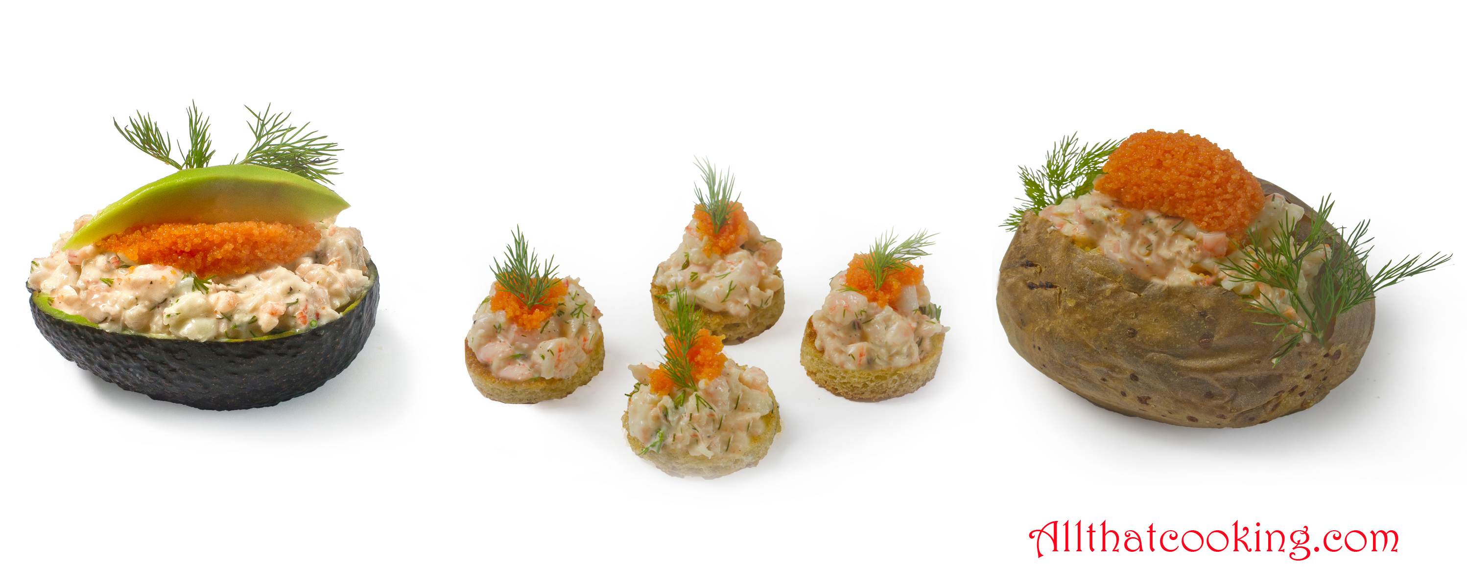 I have decided to show you Skagenröra in my 3 favorite versions:  served with avocado in an avocado shell, served as a canapé, and served in a baked potato.