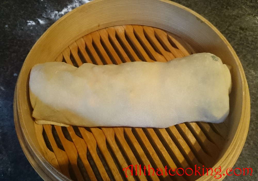 6.  Carefully settle the roll into the basket and cover with steamer lid.