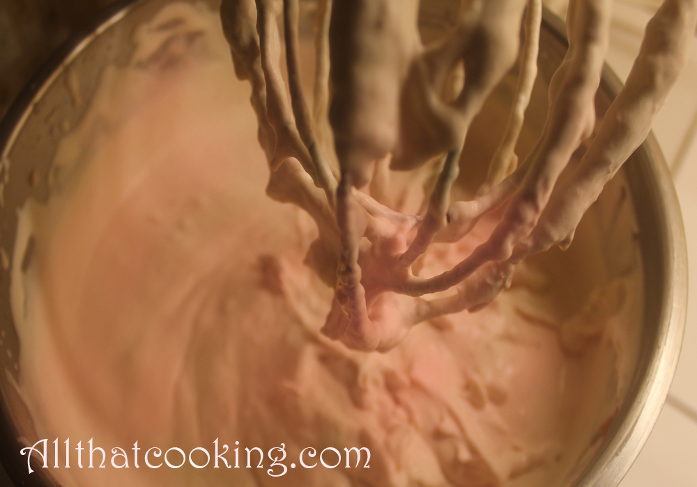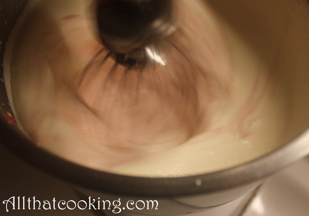 1. Leave the strawberry cream on the stand mixer. Take the egg/sugar mixture from the refrigerator and pour it into the strawberry cream.