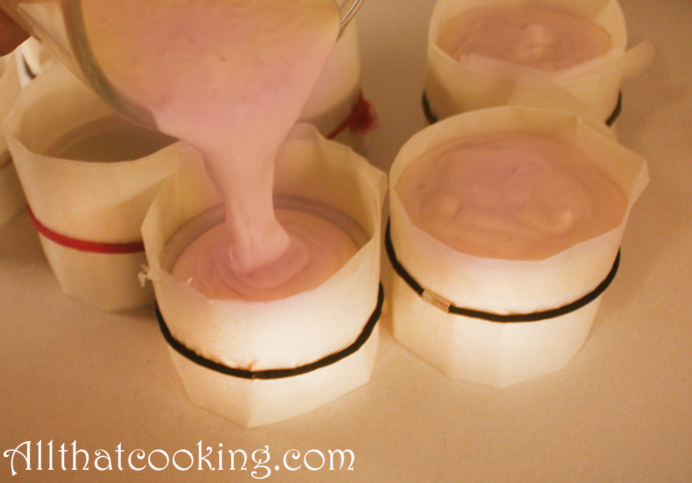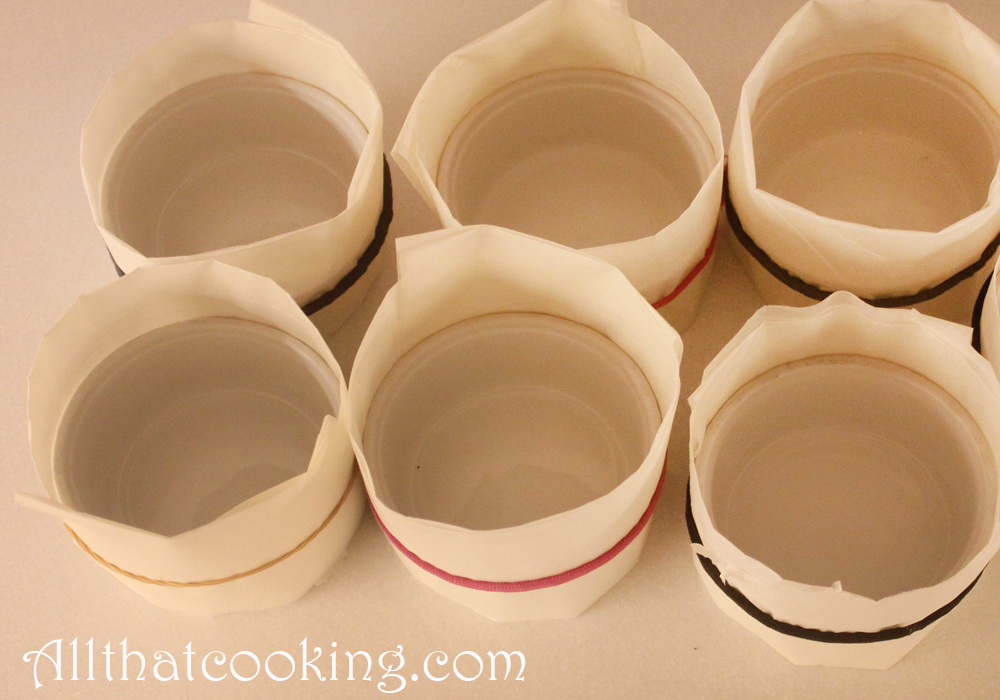 Wrap the outside of each ramekin with a strip of the paper, and make sure that the paper comes about 2-inches above the top of the ramekin. Very tightly secure the paper with a rubber band.