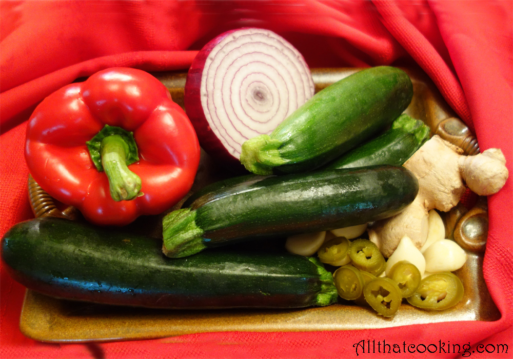 1. Combine zucchini, bell pepper, onion, jalapeno, ginger and garlic in a large bowl.