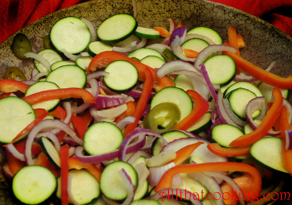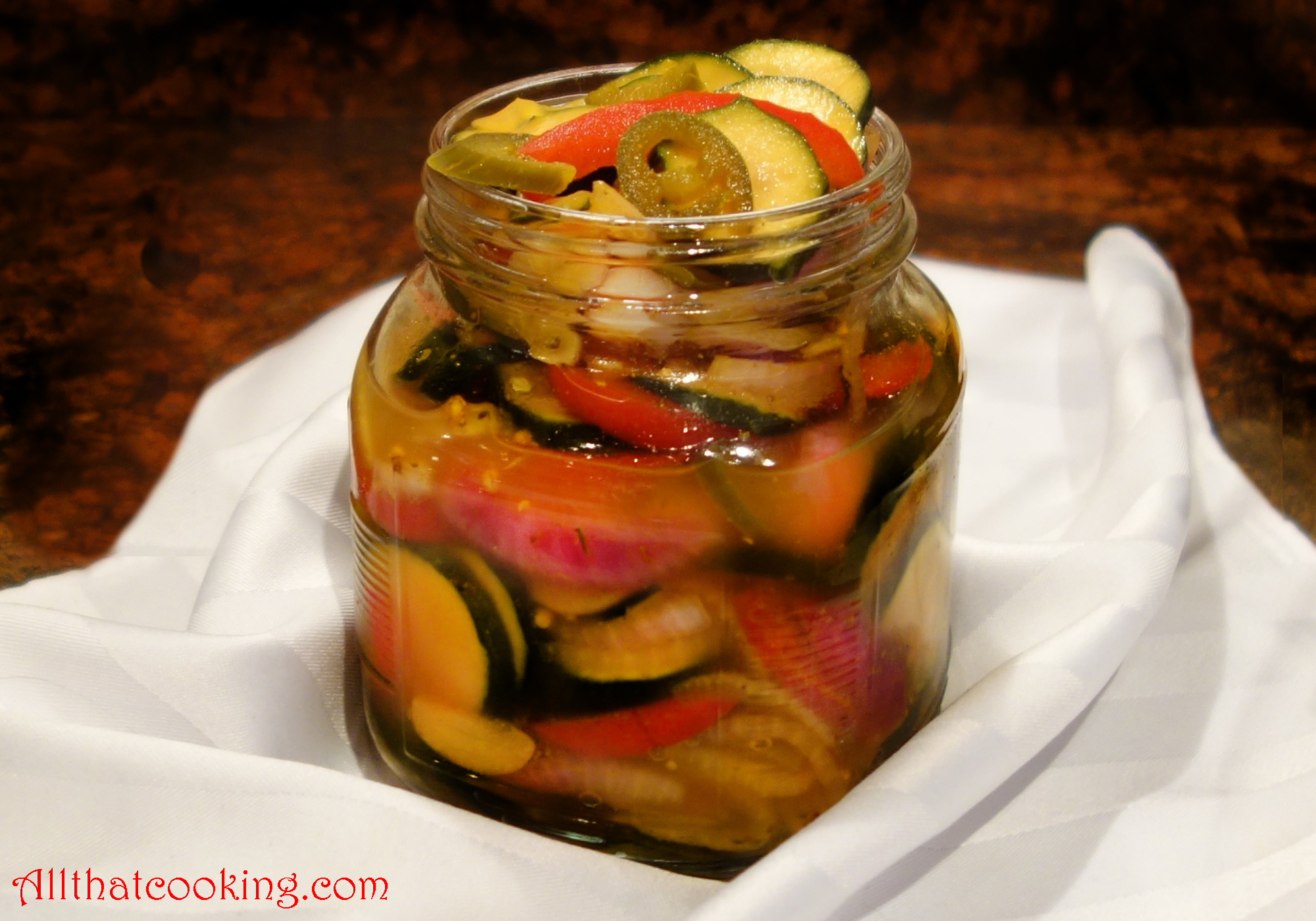 I love this recipe for its simplicity and especially for its room for flexibility. I tossed in a red bell pepper but you can easily substitute carrot slices. If you’ve got zucchini’s cousin, yellow squash, go ahead and mix it in as well. I made this batch with white wine vinegar, but plain ole vinegar will do quite nicely. Instead of a jalapeño, sprinkle in some red pepper flakes. I made use of what was left of my jar of jalapeños instead of using a fresh one this time. Well, I did say I love the flexibility of this recipe.