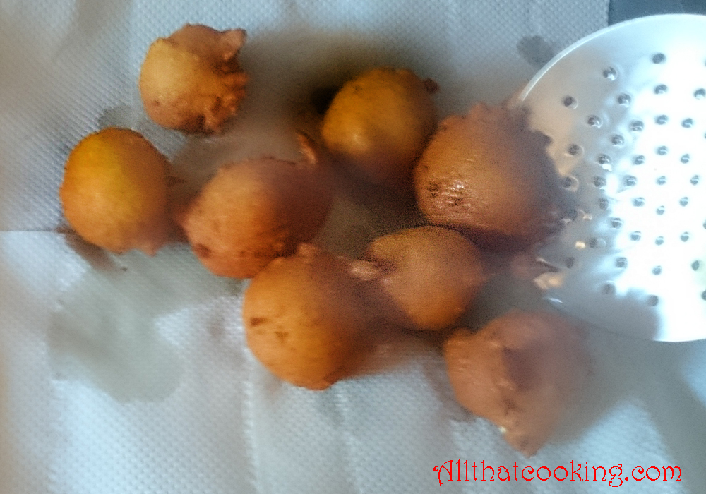 6.  Dip a tablespoon into the hot oil, then scoop a spoonful of batter.  Drop about 6 tablespoon-sized balls of better into the oil.  (After a few dips into the batter, you will need to clean off the spoon with a paper towel.)  Don’t crowd the pot. Drop about 6 tablespoon-sized balls of batter into the oil.