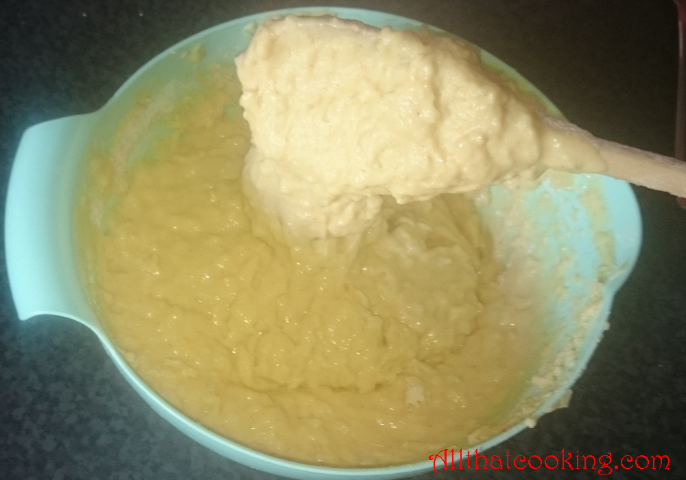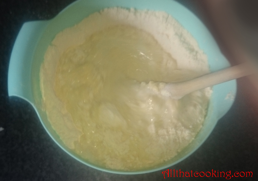 3.   Make a well in the center of the flour mixture and pour in the milk mixture.  Use a spatula to gradually work the flour mixture into the liquid.