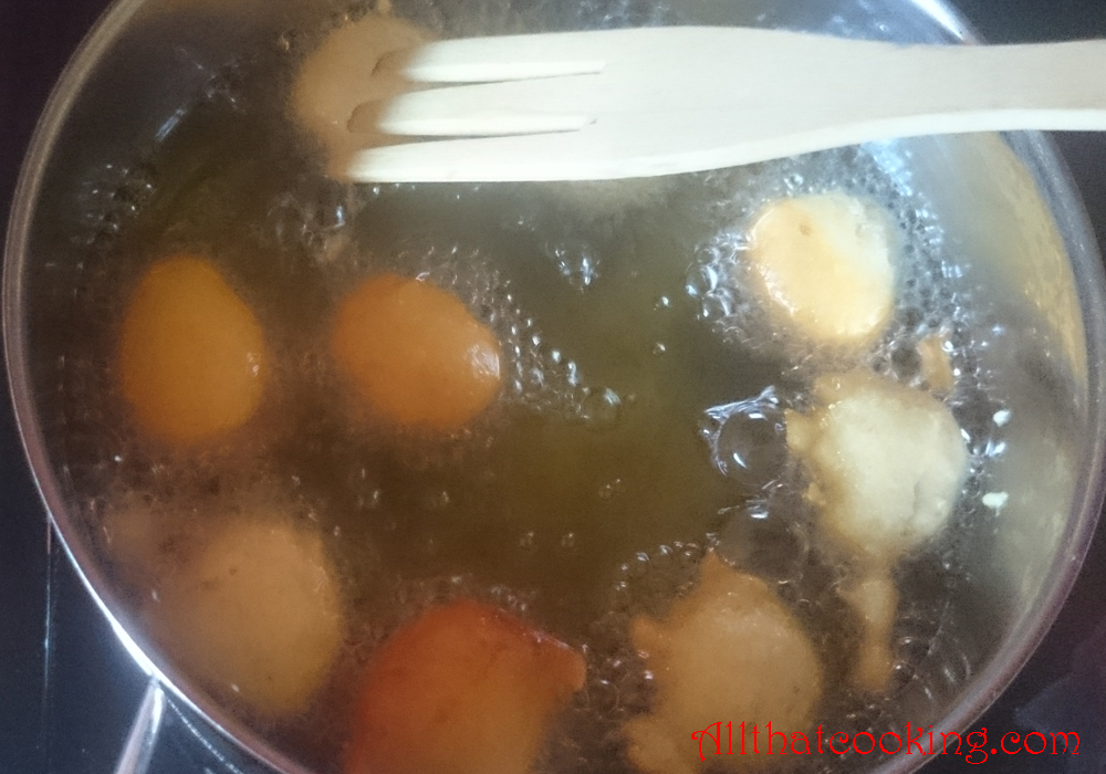 7. Fry until each hush puppy is golden brown.  Use a spatula or spoon to turn them so that they fry evenly.
