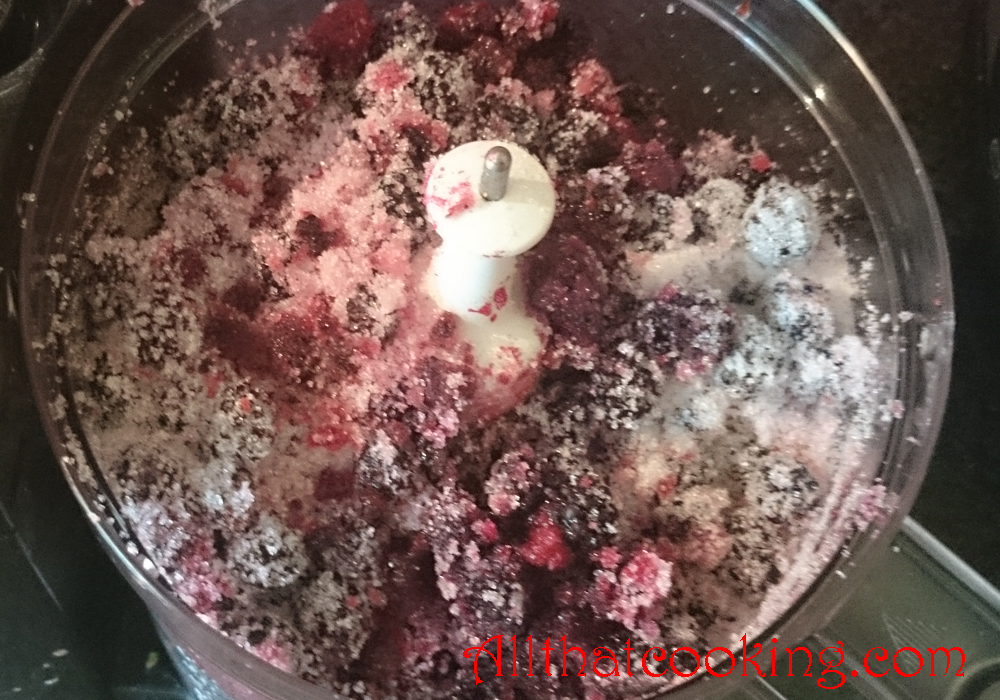 1. Place berries and sugar into the bowl of a food processor. Send them for a good spin until well mixed and you have a runny mixture.