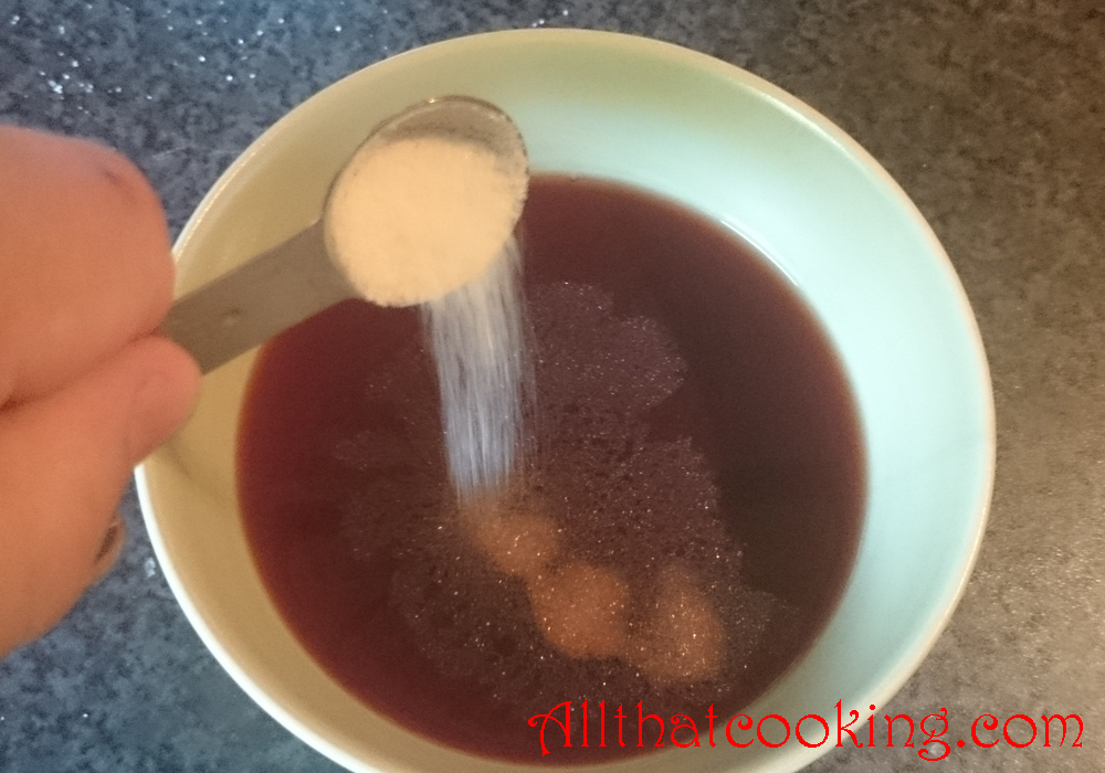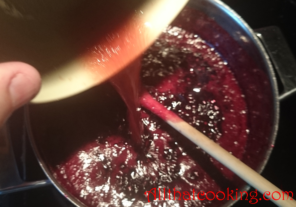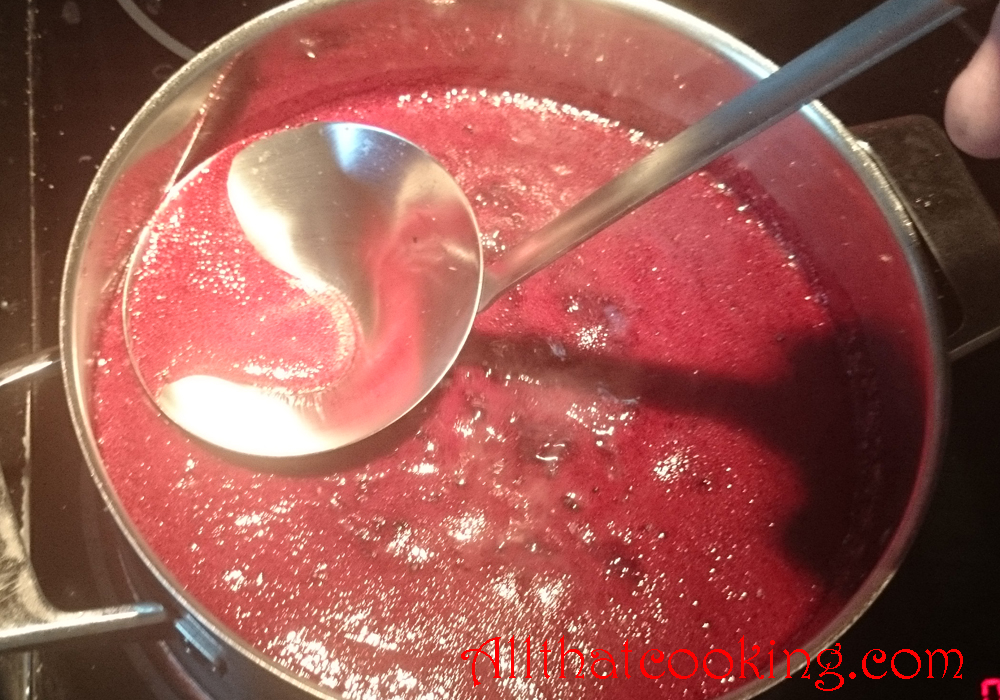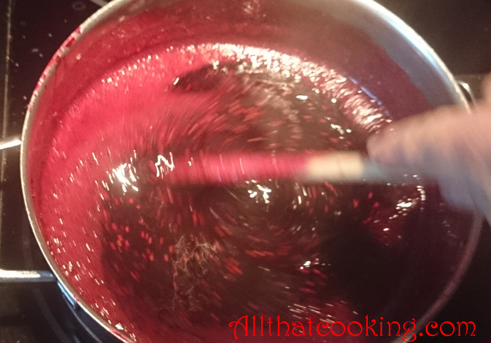 3. In the meantime mix gelatin and Port wine in a small bowl. Make sure gelatin is well dissolved. Remove berry pot from heat and stir in Port/gelatin mixture.