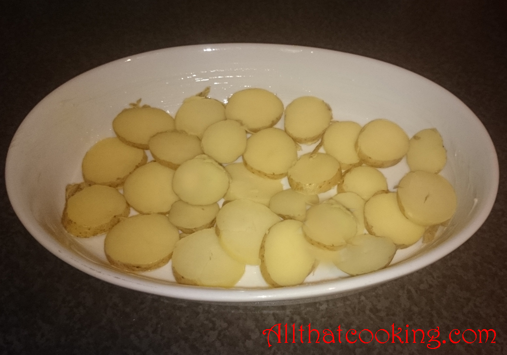 2. Boil whole potatoes until cooked through.  When cooled to room temperature, thinly slice them to about a 1/4-inch thickness