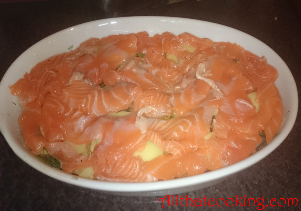 4.  Top with half of the salmon.