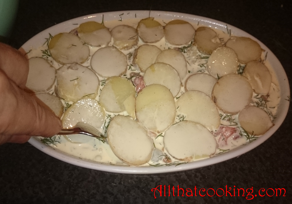 5.  Cover salmon with half of the dill and use half of the remaining potatoes to make the next layer. Lightly salt and pepper.