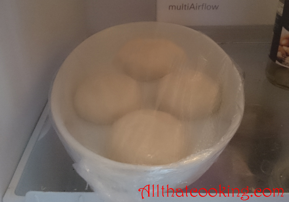 7.  When doubled in size divide the dough into 4 equal pieces and knead each into a ball. Place them on a tray or dish, cover with plastic wrap and refrigerate overnight.  The dough will continue to rise in the fridge.