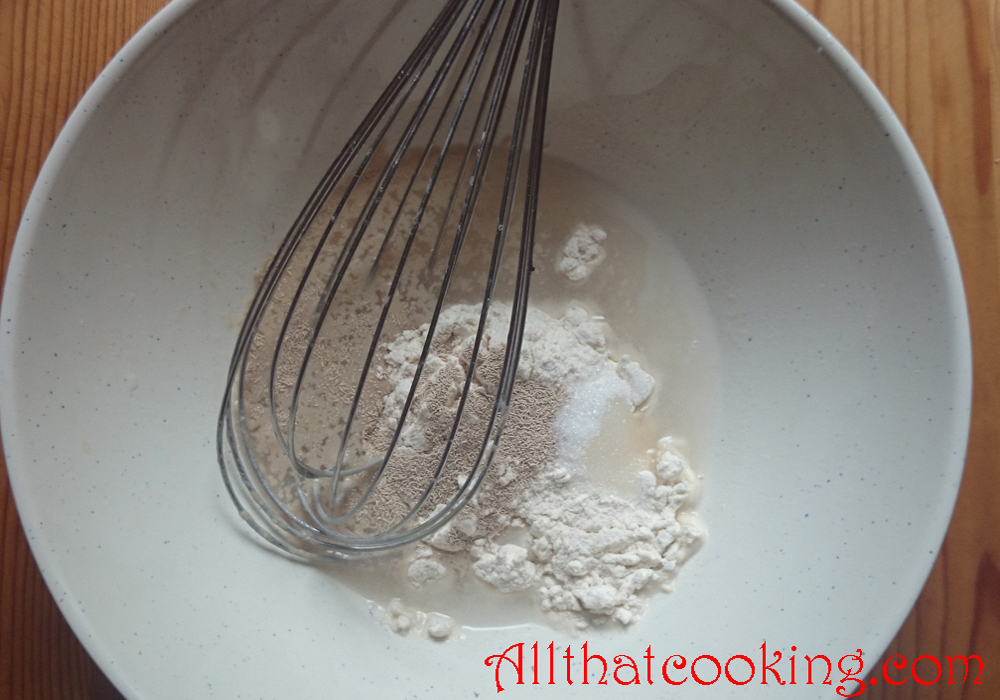 2.  Make a well in the flour, pour in the remaining water and add the yeast mixture.