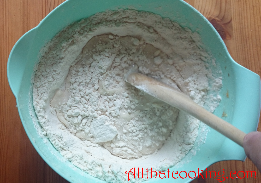 1.  In another large bowl, mix together the remaining flour and the salt.