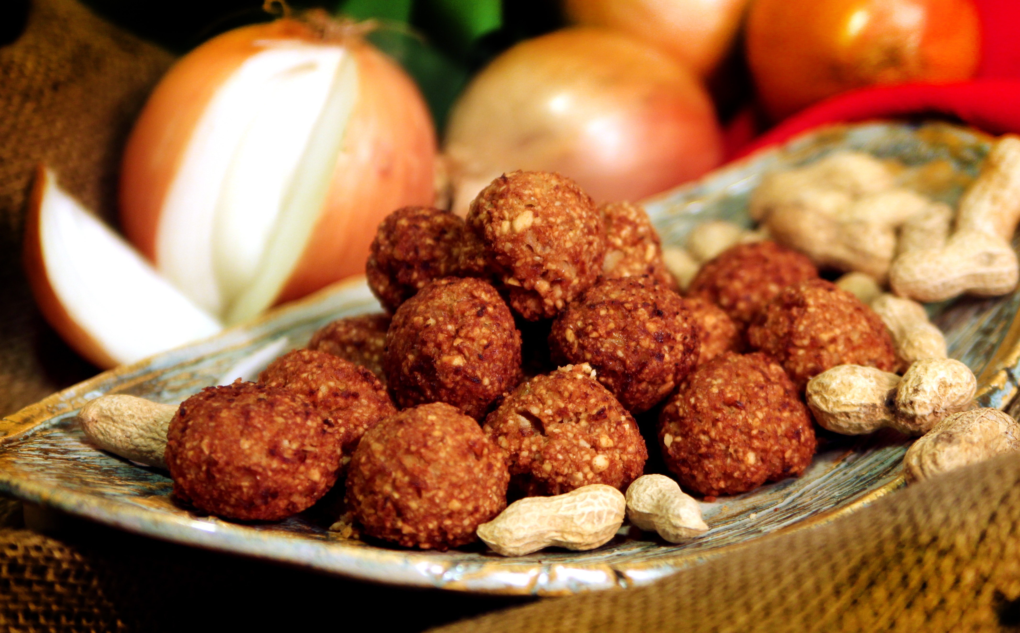The troublesome recipe in question is quite simple: dry roasted peanuts, onions and cayenne processed into a paste, then formed into little balls and deep fried. The challenge, as we saw it, was to keep these little guys from falling apart during the cooking process. Snowed in with a supply of Virginia peanuts we challenged ourselves to the task.
