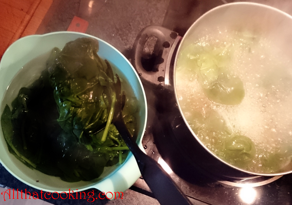2. Toss spinach into the boiling water for about 30 seconds. Immediately move spinach into the ice water bath.