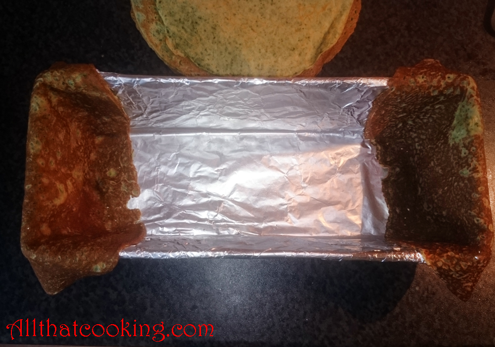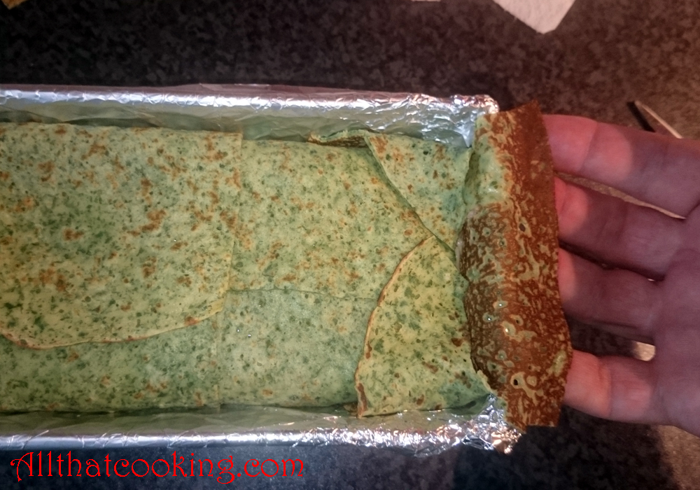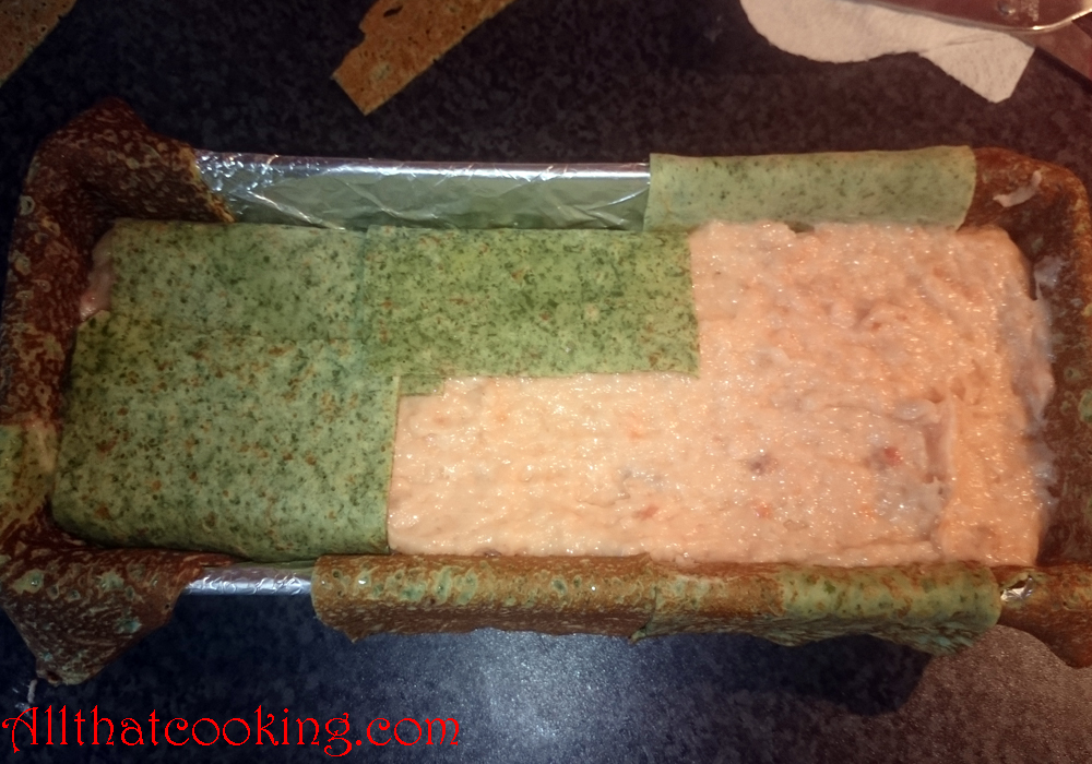 9. Bring the pancakes that are lying over the edge of the pan up and over the pâté . They should just overlap each other at the middle, so cut any pieces that overlap too much. Otherwise you will have a heavy layer of pancake on top of the loaf. Fold the ends up and over.