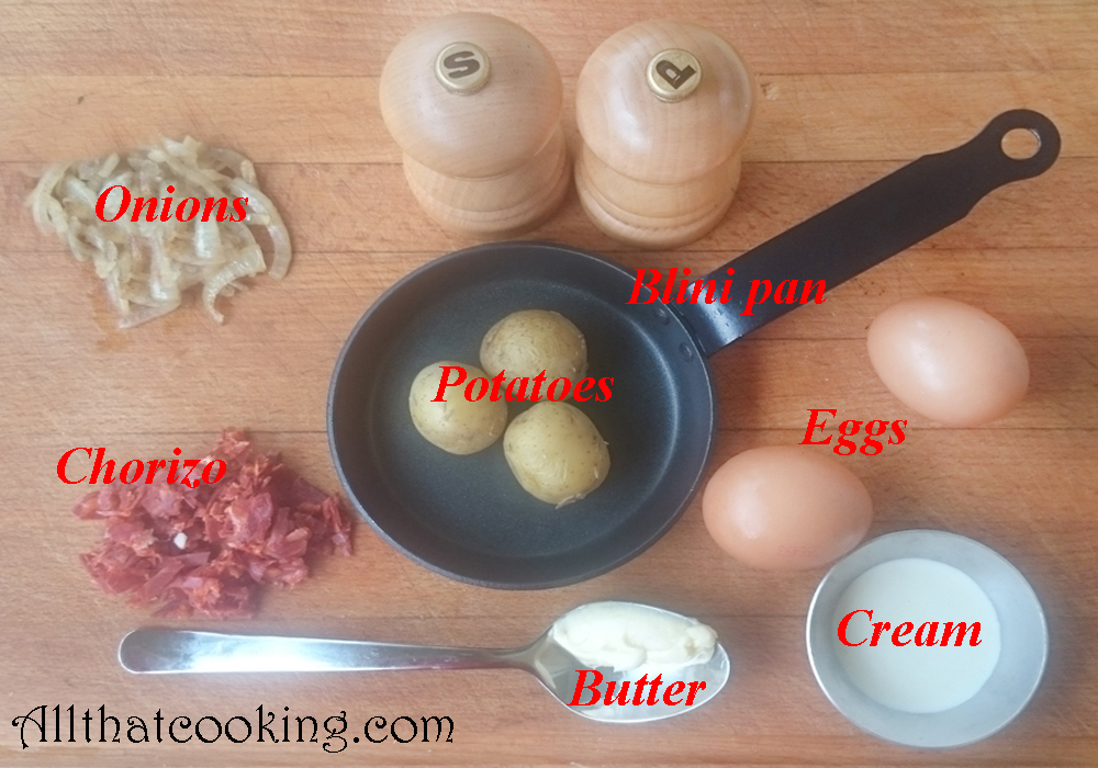 Potatoes give this light dish just enough satisfying heft. Potatoes and eggs are a classic Spanish combination. Oli added some chorizo sausage for a nice savory zing. Don’t expect a flattish, filled and folded omelet which is what we are used to. This is a lovely, puffy domed egg pie. It starts out for just a few minutes on the stove and then you just pop it in the oven. Yeah, I know its summer and you don’t want to heat up the kitchen. This guy is made in a 4-inch or 5-inch oven proof pan, so it fits quite nicely in the toaster oven.