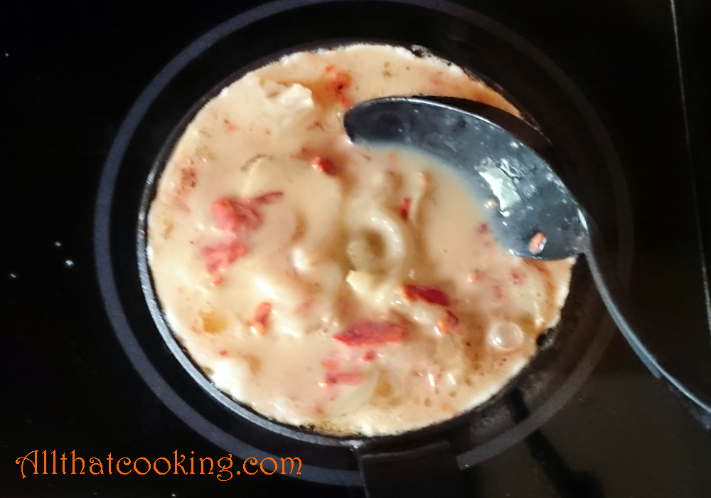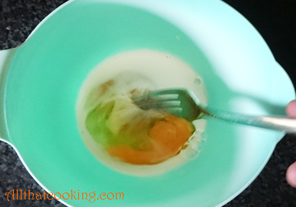 2.  Crack the eggs into a small bowl, add cream and beat with a fork until pale yellow.
