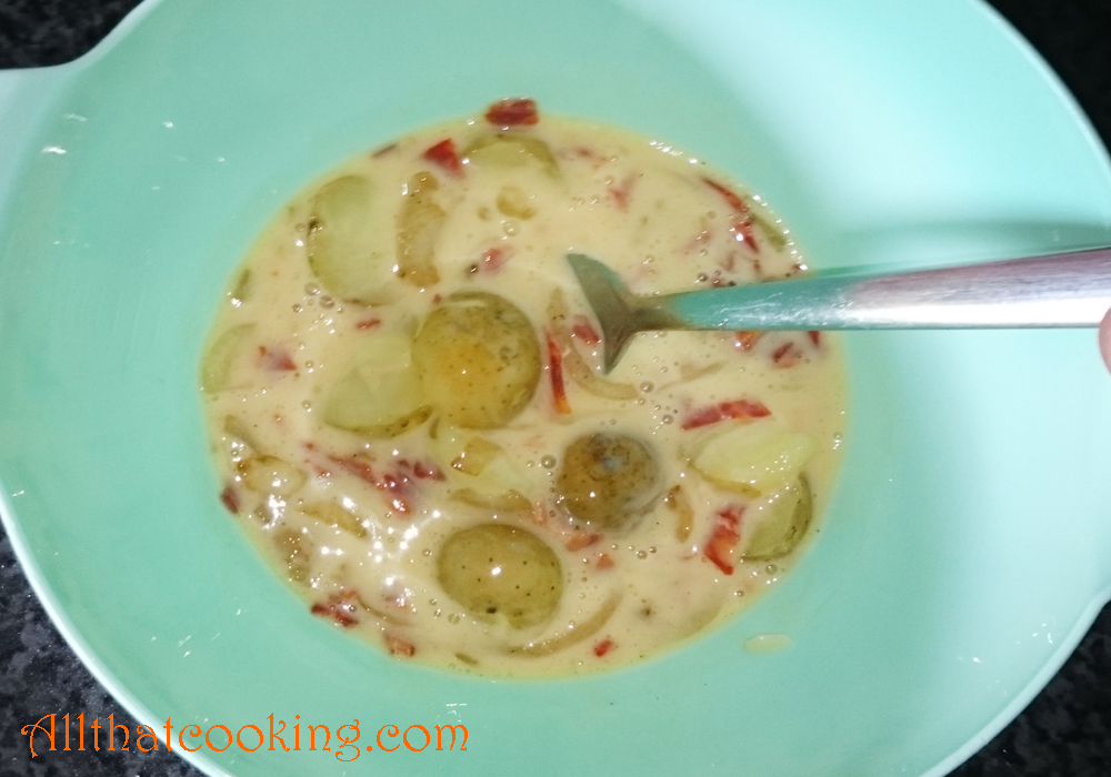 3.  Mix onions, potatoes and chorizo into egg mixture until well distributed.  Season with salt and pepper.