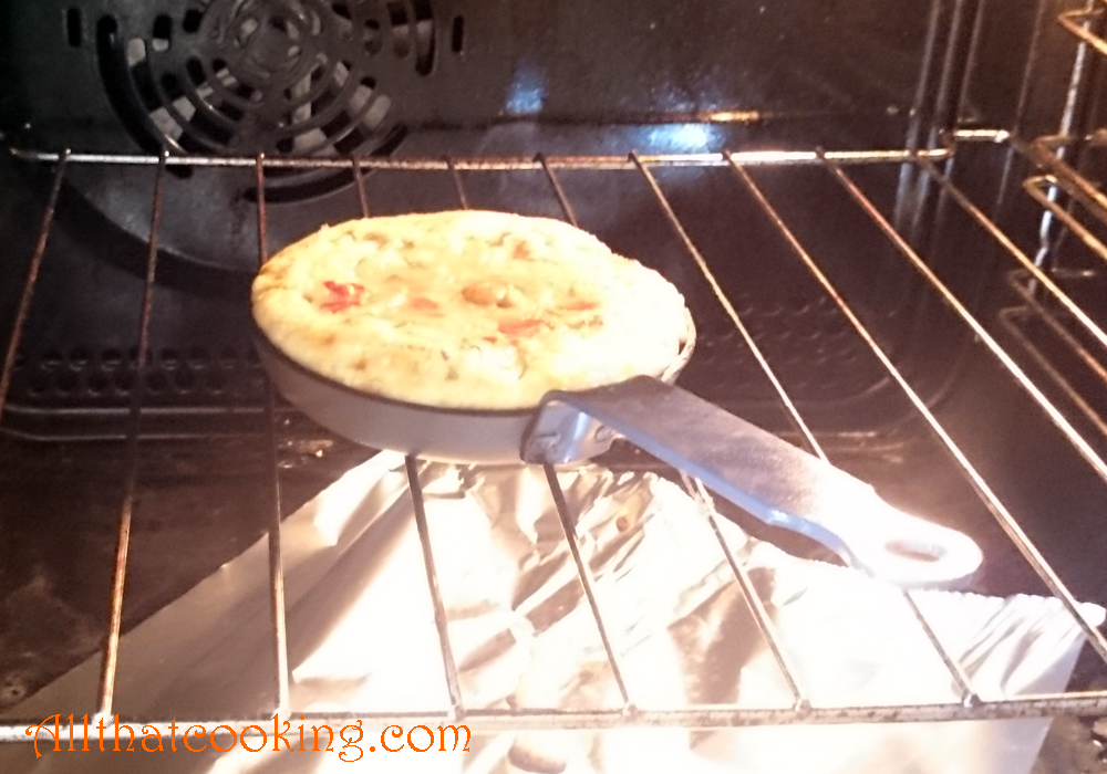4.  Melt the remaining butter in the blini pan over medium high heat.  Pour omelet mixture into pan.  It will fill the pan to the top.  Cook for 30 seconds then put the pan in the oven.  Bake until cooked through, about 10-12 minutes.